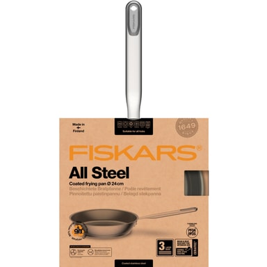 Fiskars All Steel stegepanden 24 cm har Ceratec non-stick belægning, en jævnt varmeledende 3-lags bund og et stilfuldt børstet finish, der tilbyder højtydende madlavning med 25 års garanti.Læs mere om produktet