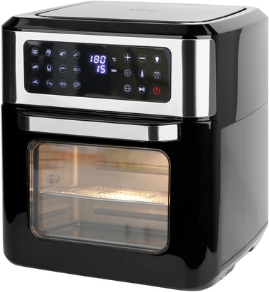 Air fryer ovnen har en kapacitet på 12 liter, hvilket er nok til at lave mad i store portioner eller til ugentlige måltidsforberedelser.