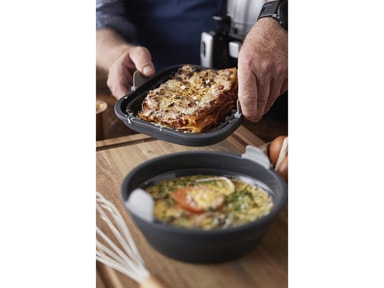 Den firkantede silikoneform passer perfekt i din airfryer. Du undgår klistrede og fastbrændte madrester i airfryeren, og silikoneformen er nem at vaske i hånden eller i opvaskemaskinenLæs mere om produktet