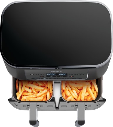 Ninja Dual Zone airfryeren har et elegant, moderne udseende med en mørkegrå finish. Den kompakte, robuste konstruktion passer godt på de fleste køkkenborde og tilbyder samtidig god tilberedningsplads.