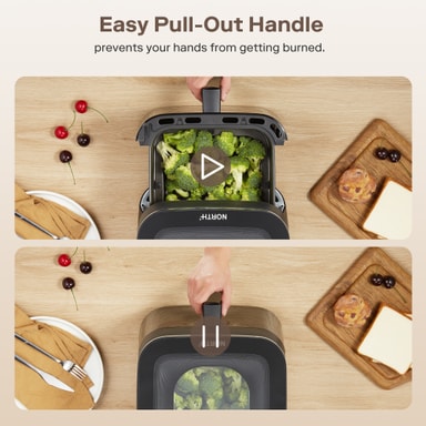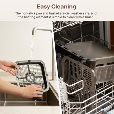 Airfryeren har en stor kurv med et håndtag og et glasvindue, så du kan se din mad lave mad i realtid. Både kurven og risten har en non-stick belægning og tåler opvaskemaskine for ubesværet rengøring.