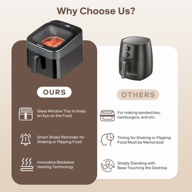 Airfryeren bruger en klingeløs varmluftcirkulationsfunktion i stedet for varmeblæsere, der fordeler varmen jævnt i hele interiøret for ensartet madlavning og en gylden sprød.