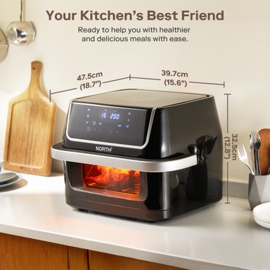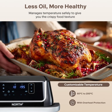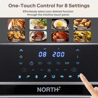 Denne North airfryer 205004 har to kurve og en kapacitet på 10 liter, så du kan tilberede store måltider og tilberede forskellige madvarer på samme tid. Med 8 forudindstillede tilberedningsfunktioner kan du stege, bage, stege, stege og grille fisk, grøntsager og kød. Displayet lader dig nemt justere tid og temperatur, mens den automatiske sluk-funktion forhindrer overophedning.