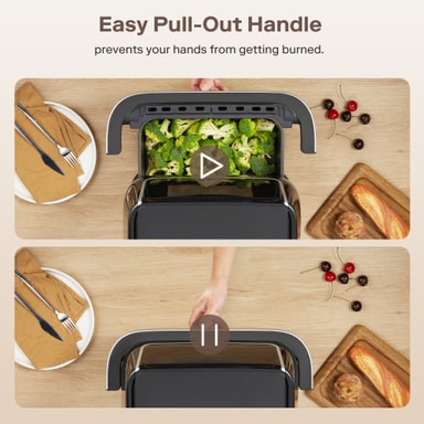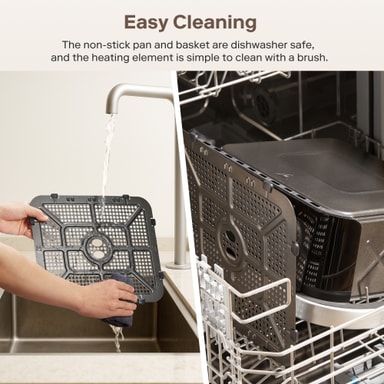 Airfryeren har 2 kurve og et glasvindue, så du kan se din mad lave mad i realtid. Både kurven og risten har en non-stick belægning og tåler opvaskemaskine for ubesværet rengøring.