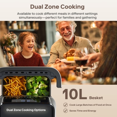 Airfryeren har en kapacitet på 10 liter, hvilket er nok til familiemåltider og madlavning i store portioner.