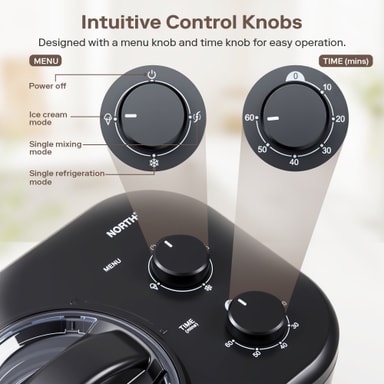Dette apparat tilbyder alsidig funktionalitet med 3 forudindstillede programmer: Is, Blanding og Køling. Vælg nemt den ønskede tilstand ved hjælp af den intuitive timerindstillingsknap for problemfri betjening.