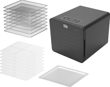 Raw dehydratoren DH8 lader dig lave sunde snacks til din familie. Med 8 bakker og en tørreflade på 0,7 m² giver den rigelig plads til bulkforberedelse. Dens timer og justerbare temperaturområde gør den praktisk til at tørre frugt, urter, nødder og svampe derhjemme.
