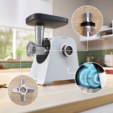 Med en intuitiv betjeningsknap og nem montering af tilbehør, bekræftet af et hørbart 'klik', er kødhakkeren brugervenlig, selv for førstegangsbrugere. De fleste dele tåler opvaskemaskine, hvilket gør rengøringen hurtig og problemfri.
