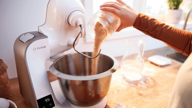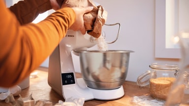 Leder du efter en alsidig køkkenmaskine, der gør madlavning og bagning både nemmere og sjovere? Så er du landet det rette sted. Bosch Serie 4 er en brugervenlig køkkenmaskine i den helt rigtige størrelse, der kan klare det meste. Den robuste røreskål i rustfrit stål rummer 3,9 liter og er velegnet til både små portioner og til nem bearbejdning af op til 2,7 kg kagedej eller 1,9 kg gærdej.