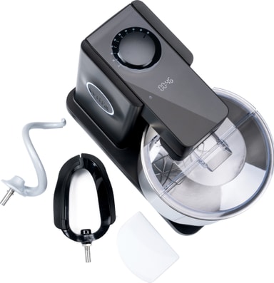Den leveres med en dejkrog til æltning, en flexi-pisker til blanding og skrabning, en dobbelt ballonpisker til at tilføre luft til blandinger, et stænklåg til at reducere rod, og en dejskraber til nem håndtering og oprydning.