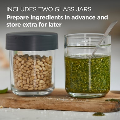 Sættet inkluderer to glasbeholdere, så du kan hakke og forberede flere ingredienser på én gang eller opbevare én portion, mens du arbejder med en anden. Dette er særligt praktisk, når du laver større måltider eller eksperimenterer med forskellige smage.