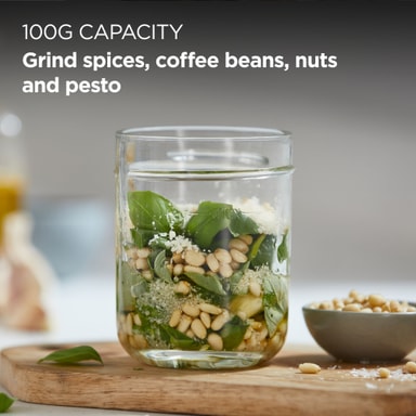 Med en kapacitet på 100 g er den perfekt til at hakke mindre portioner af tørre ingredienser som kaffebønner, nødder eller krydderier.