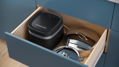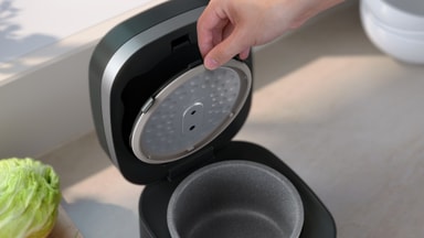 Riskogeren leveres med et aftageligt låg, som er nemt at rengøre. Non-stick-belægningen forhindrer ophobning af madrester.
