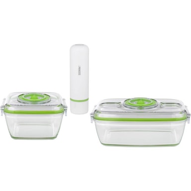 Med Princess 492985 håndvakuumsæt kan du nemt vakuumere og opbevare dine levnedsmidler. Med den bærbare elektriske vakuummaskine kan du opbevare din mad i op til 4x længere! Takket være de 2 glasbeholdere (0,7 L + 1,1 L) behøver du ikke længere at bruge plastikposer. ideal til tilberedning af måltider eller nemt til beskyttelse af miljøet. Hvis du vakuumerer dine levnedsmidler med Princess bærbar vakuumapparat, skal du fjerne færre levnedsmidler, bruger mindre plast og er miljøbevidst! Ingen fødevareaffald - genpåfyldning, reducering og genanvendelse Hvert år smides beholdere med fødevarer unødigt væk. Ved at fryse din mad en anden gang, kan du allerede yde et bidrag til et bedre miljø. Med Princess håndvakuumsæt kan du opbevare dine fødevarer vakuumpakket, så de er holdbare i længere tid og forbliver friske i fryseren eller køleskabet. Med den elektriske vakuumpumpe skaber den gennemsigtige fødevarebeholder et vakuum og tætnes hermetisk. På det BPA-frie plastiklåg kan du vise den dato, hvor du har pakket din mad, ved hjælp af datoangiveren, så du til enhver tid kan kontrollere, om det stadig er godt. Op til 4 gange længere holdbarhed Ved at forsegle dine madrester kan du opbevare op til 4 x længere! Desuden bevarer du smag og vitaminer, og du kan også nyde et lækker måltid næste gang. Vakuumforsegler-sættet indeholder en elektrisk vakuumpumpe, som du kan oplade med det medfølgende USB-kabel. Kablet og pumpen kan let gemmes i bestikskuffen eller i køkkenmaskinerne. Fryse-, ovn-, skylemaskiner og mikrobølgefast Glasskålene er meget nemme at betjene og kan opvarmes eller fryses. Stil din dybfrosne Lasagne direkte i ovnen eller tilbered dit måltid i mikrobølgeovnen. Princess håndvakuumsæt kan desuden udvides med ekstra beholdere. OBS! Denne produktbeskrivelse er endnu ikke blevet oversat til dansk af vores oversættere. Derfor er teksten maskineoversat fra den tyske originaltekst.