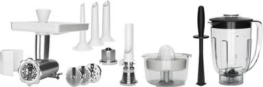 Ankarsrum Deluxe tilbehørssættet 920900085 udvider Assistent Original køkkenmaskinen til et komplet køkkenværktøjssæt. Det inkluderer tilbehør til at male, blande, presse og rive, sammen med en citruspresser, blender og pølsemagningsværktøj, som giver dig alt, hvad du har brug for til alsidig, daglig madlavning. Sættet inkluderer en kødhakker, fire hulplader (2,5, 4,5, 6 og 8 mm), tre pølsehorn (10, 20 og 25 mm), en si, rivejern, citruspresser, blender og blandestav, der tilbyder komplet alsidighed til enhver køkkenopgave.