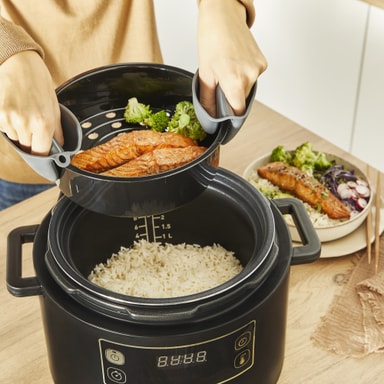 Når du er færdig med at lave mad, kan du lægge tilbehøret til multicookeren i opvaskemaskinen.