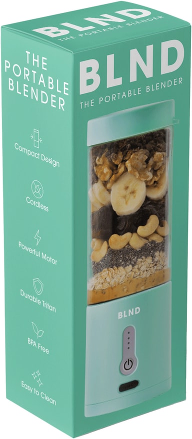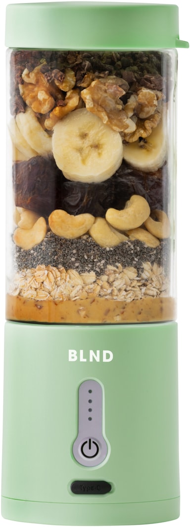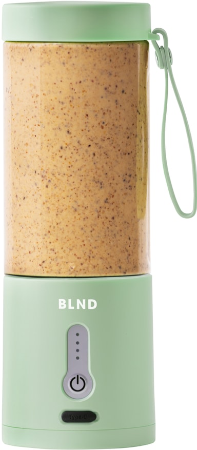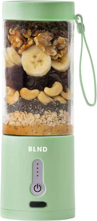 BLND blender MNT er ideel til at lave smoothies og proteinshakes på farten. Dens 600 ml beholder, skarpe blade og kraftfulde 120W DC-motor blender frugt, grøntsager og nødder til en glat blanding. Designet med fokus på bekvemmelighed har den en vandtæt type-C opladningsport og et låsesystem for at forhindre spild og sikre sikker brug.