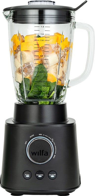 Når du har lyst til en forfriskende smoothie, kan du altid stole på, at Wilfa Essential 1800 Auto blender RBLP-1800B giver dig netop det takket være dens 1800 watt, 4 knive, trinløs hastighedskontrol, smoothie- og isknusningsfunktioner og en glaskrukke på 1,8 l.