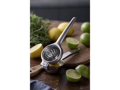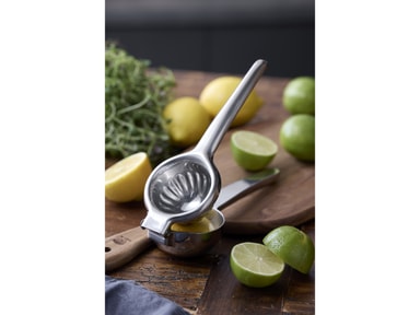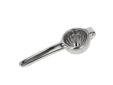 Den klassiske citruspresser af rustfrit stål er enkel at anvende: Citrusfrugten halveres og lægges over hullerne med frugtkødet nedad og skrællen opad. På den måde presses frugtens inderside udad, når du presser håndtagene sammen, så saften løber ud gennem hullerne, mens kerner og frugtkød bliver i presseren. Pres direkte ned i maden, drinken og dressingen og undgå spild af saft. Velegnet til limefrugter, citroner og små appelsiner. Længde 21 cm, indre diameter 6 cm. Vaskes i opvaskemaskine før første brug.