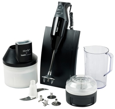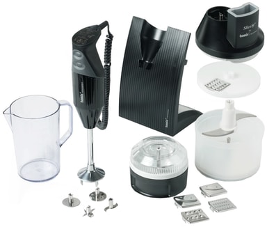 Superbox stavblenderen giver dig udover blenderen, et væld af brugbart tilbehør. Du får alt fra piskeris, kød-/grøntsagsklinge, SliceSy med seks klinger og et rivejern samt en multifunktionel knivklinge. Derudover får du også en 1 l kande og et stativ.