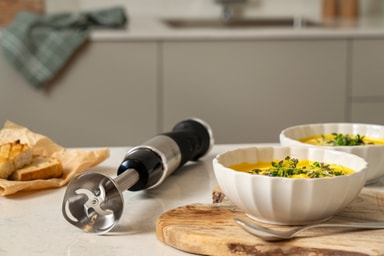 OBH Nordica Quickchef+ stavblenderen HN6738S0 har en motor på 1.000 W, 20 hastighedsindstillinger og forskelligt tilbehør, der gør det nemmere at tilberede måltider. Ved hjælp af Powelix-teknologi skærer den ubesværet gennem hårde ingredienser, hvilket gør den velegnet til tilberedning af puréer, supper, sorbeter og meget mere.