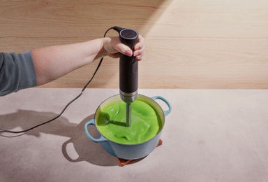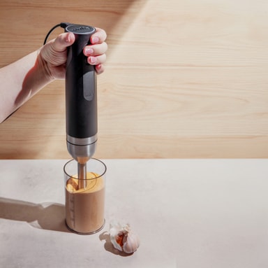 Den inkluderer to aftagelige blenderstave designet til forskellige portionsstørrelser. Den mindre stav er perfekt til saucer og emulsioner, mens den større stav nemt håndterer supper, smoothies og større portioner. Begge stave er ridsefri og sikre til brug i slip-let køkkengrej.