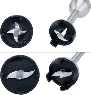 Prostick leveres med et komplet sæt tilbehør af professionel kvalitet: to blenderstave, en præcisionshakker, dobbelte piskeris og to målebægre med låg. Dette alt-i-én-sæt dækker en bred vifte af køkkenopgaver med lethed.