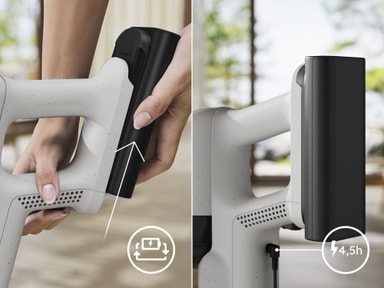 *Sammenlignet med køretid i Boost tilstand. **Baseret på interne tests ifølge IEC 62885-4 standarden, der måler køretiden for håndholdt enhed og fuld støvsuger i min. tilstand.