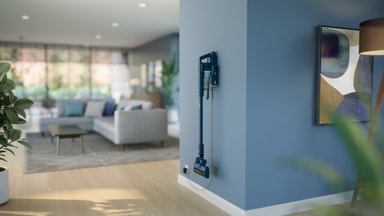 Støvsugeren har et vægophængsdesign, der optager mindre plads og opbevarer alt tilbehøret praktisk. Den leveres også med en Aqua-moppe og LED-lys på TriActive-mundstykket for nem registrering af snavs.
