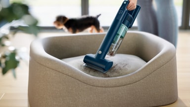 Støvsugeren har en poseløs 3-lags filtrering, der bruger ultrafine filtre til at opfange snavs og fint støv, hvilket holder dine gulve, tæpper og andre overflader rene.
