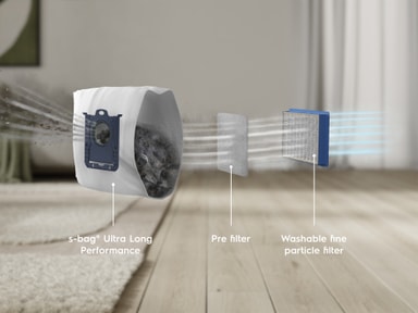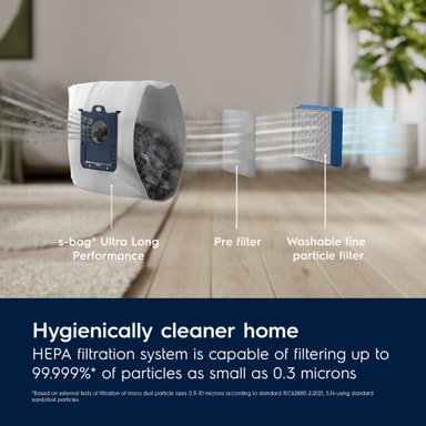 Støvsugeren har et vaskbart HEPA fint støvfilter, der kan fange dyrepels, støv og snavs fra alle overflader.