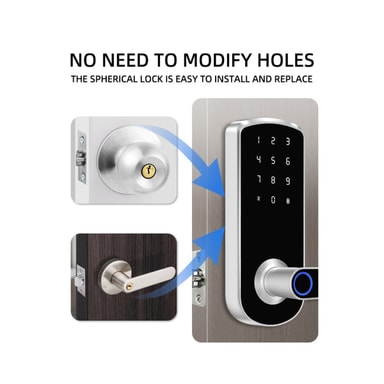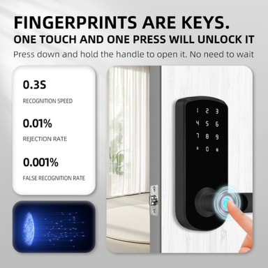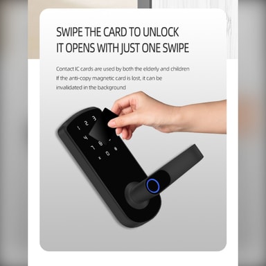 Sikr dit hjem med Smart Door Lock Fingeraftryk Tuya. Har TTLock Bluetooth, fingeraftryk, adgangskode, NFC, kort, nøgle og midlertidig adgangskodeoplåsning. Ideel til hjem, lejligheder, hoteller og skoler med indendørs trædøre.Læs mere om produktet