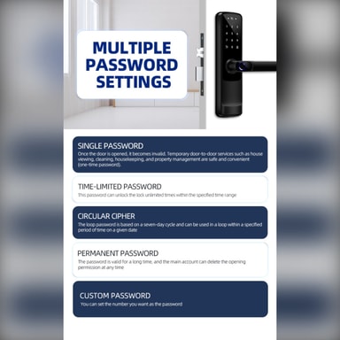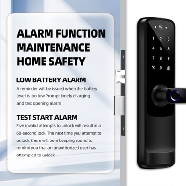 Flere oplåsningsmetoder: Oplev ultimativ fleksibilitet med Tuya WiFi Smart Dørlås's flere oplåsningsmetoder. Vælg mellem fingeraftryksgenkendelse, adgangskodeindtastning, RFID-kortadgang eller traditionel nøgleoplåsning, der imødekommer din foretrukne indgangsmetode. Den højpræcise fingeraftrykssensor sikrer hurtig og nøjagtig identifikation, mens den tilpasselige adgangskodefunktion giver dig mulighed for at oprette unikke koder til forskellige brugere. De medfølgende RFID-kort giver et praktisk alternativ til familiemedlemmer eller gæster. I tilfælde af nødsituationer eller glemte koder tilbyder den traditionelle nøgleoplåsningsmulighed en pålidelig backup-løsning. Denne alsidige smarte lås tilpasser sig din livsstil og giver en problemfri og sikker indgangsoplevelse hver gang. Tuya WiFi Smart Dørlås er designet til nem installation og brugervenlig betjening.