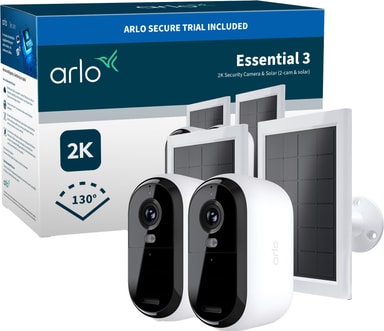 Dette Arlo Essential 3 2K-overvågningskamera leverer skarp 2K-video, natteoptagelser i farver og en indbygget projektør. Det har dual-band Wi-Fi, en bred synsvinkel på 130°, tovejslyd og en sirene.Læs mere om produktet