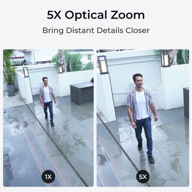 Fang hver detalje i skarp 4K Ultra HD. Den 8MP sensor leverer klare optagelser i høj opløsning, mens det 5× optiske zoom giver dig mulighed for at forstørre fjerne områder uden at miste kvalitet, hvilket gør det perfekt til indkørsler, indgange eller store udendørsarealer.