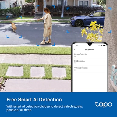Kameraet har Smart AI-detektion, som gør det nemt at spotte køretøjer, mennesker eller kæledyr, og takket være alarmsystemet får du besked om mistænkelig aktivitet eller bliver advaret om problemer. Du kan selv konfigurere eller tænde for alarmen via Tapo-appen.