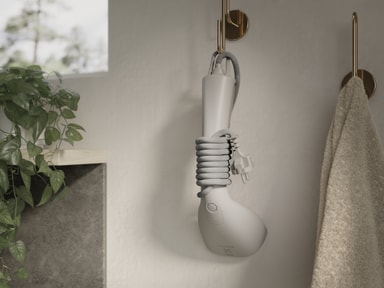 Damperen kan nemt holdes på pause og opbevares, selv under brug. Læg den ned uden at bekymre dig om, at restvarme beskadiger stoffet. Når du er færdig, hæng den op med den integrerede krog.