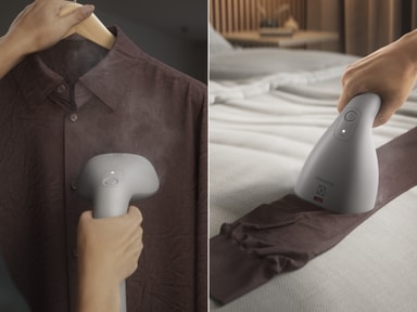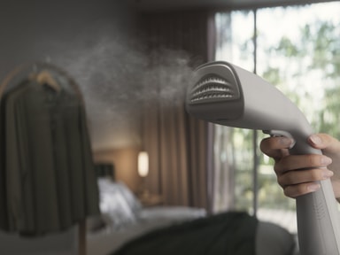 Den kompakte tøjdamper har et foldbart håndtag, der er let at flytte rundt på og opbevare i skabet.