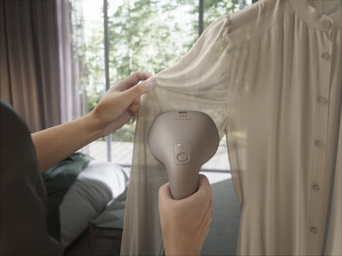 Electrolux-beklædningsdamperen er sikker til alle strygelige stoffer og tilbyder bekymringsfri brug uden risiko for forbrændinger. Den inkluderer også en varmebestandig taske, der fungerer som en beskyttelseshandske til at beskytte dine hænder mod den varme damp.