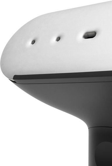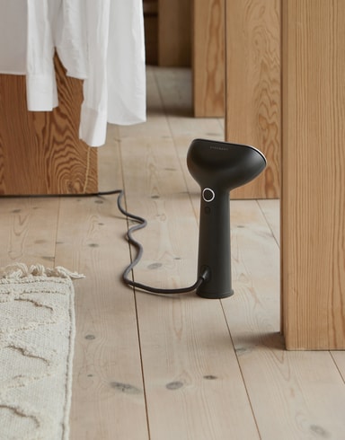 Den kompakte tøjdamper har en elegant silhuet i skandinavisk minimalistisk design. Der er intuitive knapper på den for nem betjening. Dens kompakte størrelse gør apparatet bærbart og ideelt til hurtige opfriskninger og rejsebrug. Den kan stå oprejst eller lægges fladt på jorden for praktisk opbevaring.