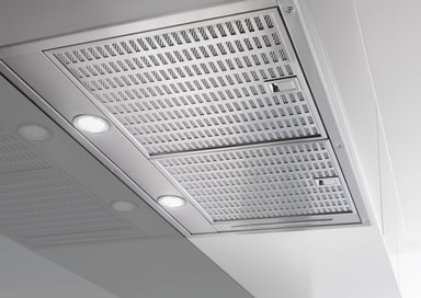 Indsatsemhætte til kombination med en ekstern blæser til reduceret lydniveau køkkenet.
