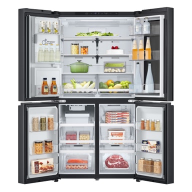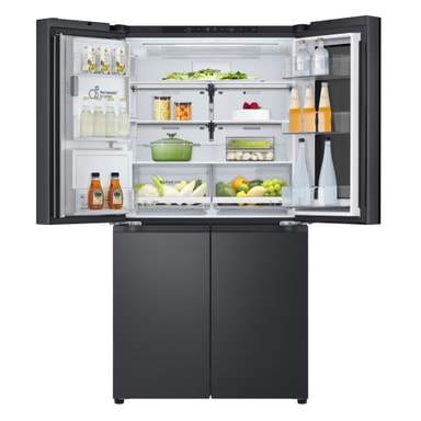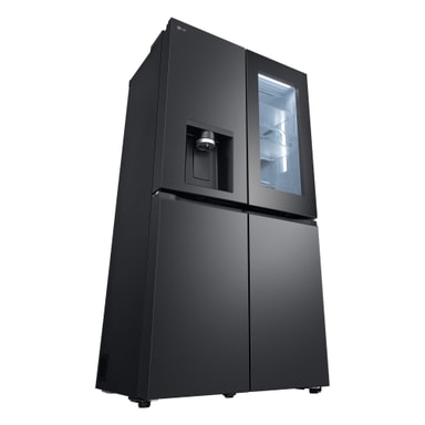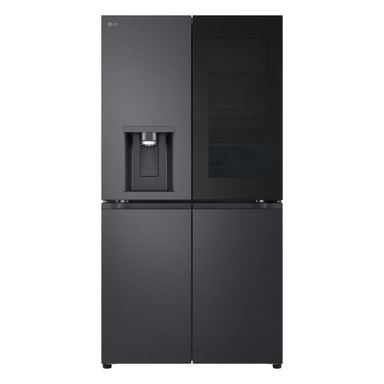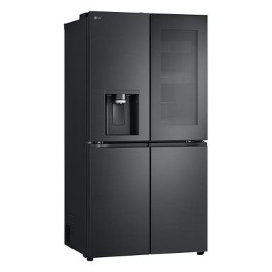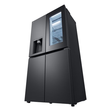 Dette stilfulde nye InstaView French Door Side-by-Side køleskab med helt flade låger i Essence Black Steel har mange funktioner til at bevare mad så længe som muligt og har også et meget flot design.