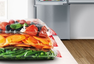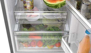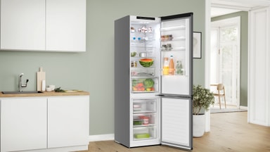 *Brugen af CO₂-reduceret stål (særligt forarbejdet stål), skum og plast i produktionen af specifikke Bosch-køleskabe (standardstørrelse: KGN39VXAT, XL-størrelse: KGN492IAF) er verificeret gennem massebalanceringsberegninger i overensstemmelse med ISO 22095. Under fremstillingen blandes disse materialer delvist med konventionelle materialer, men deres certificerede egenskaber tildeles Bosch-køleskabene via denne metode. Materialernes egenskaber (ekskl. emballage) vurderes i henhold til ISO 14067.