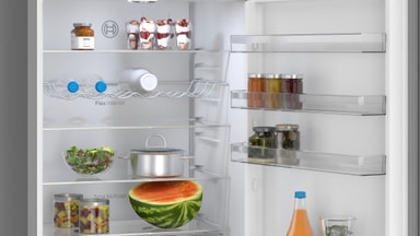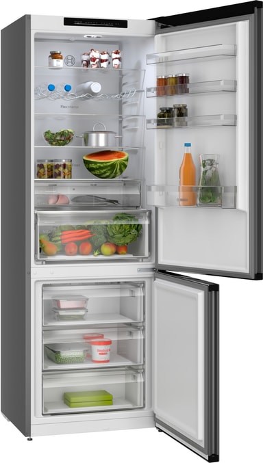 *Brugen af CO₂-reduceret stål (særligt forarbejdet stål), skum og plast i produktionen af specifikke Bosch-køleskabe (standardstørrelse: KGN39VXAT, XL-størrelse: KGN492IAF) er verificeret gennem massebalanceringsberegninger i overensstemmelse med ISO 22095. Under fremstillingen blandes disse materialer delvist med konventionelle materialer, men deres certificerede egenskaber tildeles Bosch-køleskabene via denne metode. Materialernes egenskaber (ekskl. emballage) vurderes i henhold til ISO 14067.