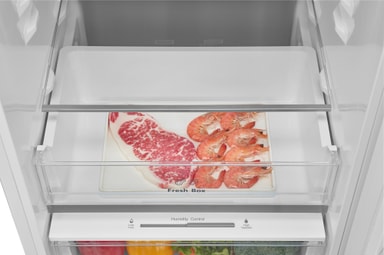 Køleskabet har en kapacitet på 193 liter, hvilket giver masser af plads til alle typer af fødevarer. Indvendigt er det opdelt i 3 glashylder, 2 grøntsagsskuffer og en flaskehylde, så hver vare finder sin plads. Den øverste skuffe med justerbar temperatur er perfekt til opbevaring af kød, frugt eller grøntsager. Den nederste skuffe med fugtighedskontrol skaber et optimalt miljø for forskellige slags frugt og grøntsager.