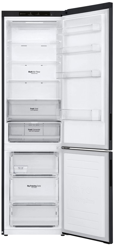 Dette LG køle/fryseskab GBP62MCNAC giver en praktisk og effektiv madopbevaring til enhver husstand. Det skaber optimale opbevaringsforhold takket være MultiFlow- og NoFrost-teknologierne, og du kan opbevare dine madvarer i et rummeligt køleskab på 227 liter og et fryserum på 107 liter.