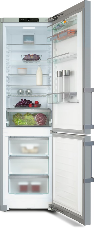 Køle- og fryseskabsdør, der lukker lydløst og automatisk med SoftClose, det Mieles innovative lukkesystem. Døren lukker automatisk fra en vinkel på over 30 grader. Hertil dæmper SoftClose døren ved lukning - aldrig mere klirrende flasker i døren.