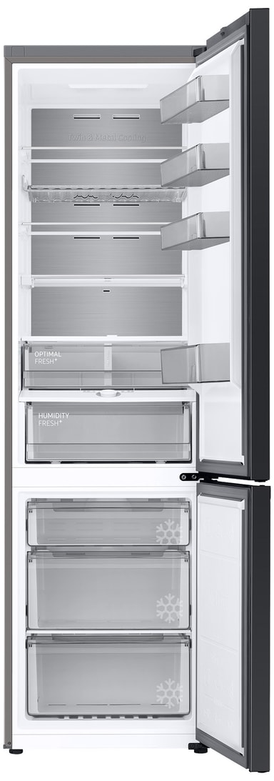 Dette fritstående Bespoke Samsung køle/fryseskab RL38A7B63B1/EF kombinerer minimalistisk stil med særlige funktioner, som skaber den rette luftfugtighed og de rigtige temperaturforhold til dine ingredienser. Få glæde af et 273 l køleskab og en 114 l fryser med NoFrost-teknologi, en Fast Freezing-funktion, en HumidityFresh+ zone, en OptimalFresh+ zone og energieffektiv LED-belysning.