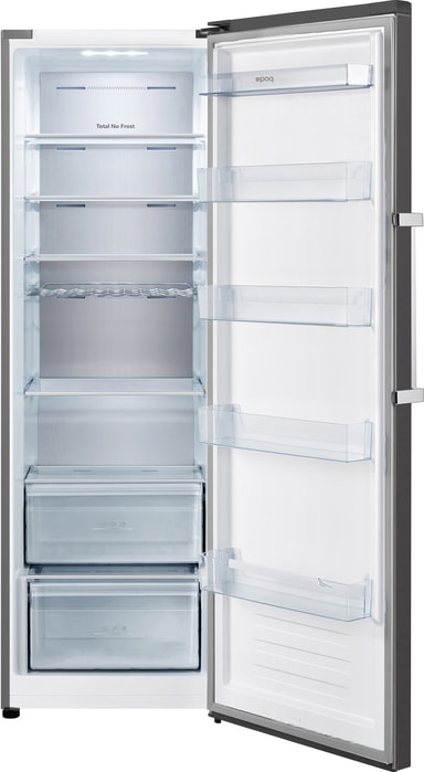 Epoq køleskabet ETR185DI23D byder på en generøs kapacitet på 370 liter, fordelt over seks hylder, en grøntsagsskuffe og en separat flaskehylde til praktisk opbevaring. Designet har justerbare fødder og hjul for nemmere mobilitet, mens de højre-vendbare dørhængsler giver mulighed for alsidig placering og frostfri-teknologien sørger for vedligeholdelsesfri drift. Derudover er køleskabet en ideel blanding af funktionalitet og sikkerhed med et display til temperaturstyring og børnesikringsfunktioner, mens LED-lyset giver et klart overblik over hele interiøret.