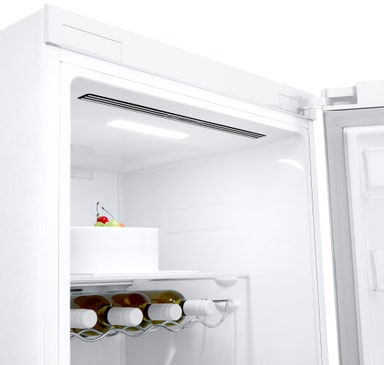 Hele køleskabet køles jævnt for at sikre, at alle dine madvarer har de bedste temperaturer til at holde dem friske i længst mulig tid. Dette opnås ved, at den kølige luft strømmer ind i køleskabet i flere retninger på samme tid.